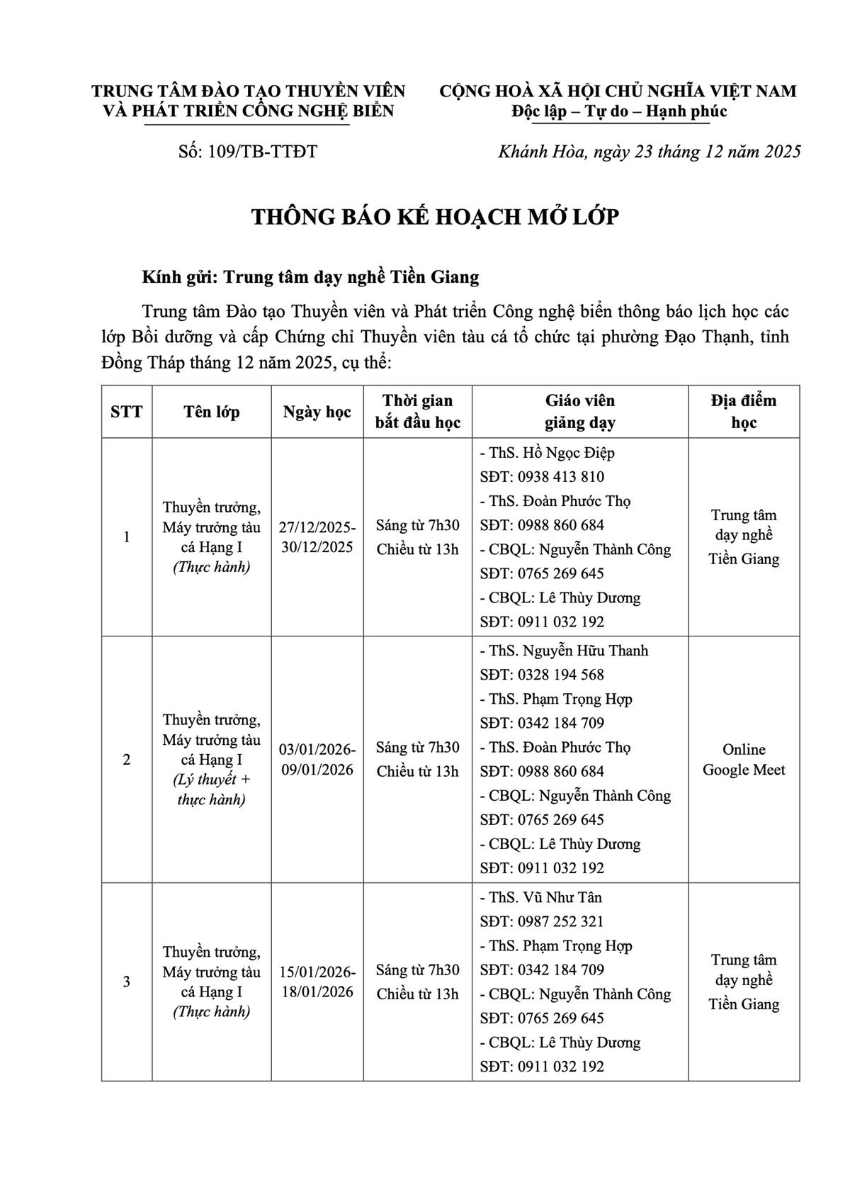 Thông báo - Kế hoạch Đào tạo tại P. Đạo Thạnh, tỉnh Đồng Tháp tháng 12 năm 2025