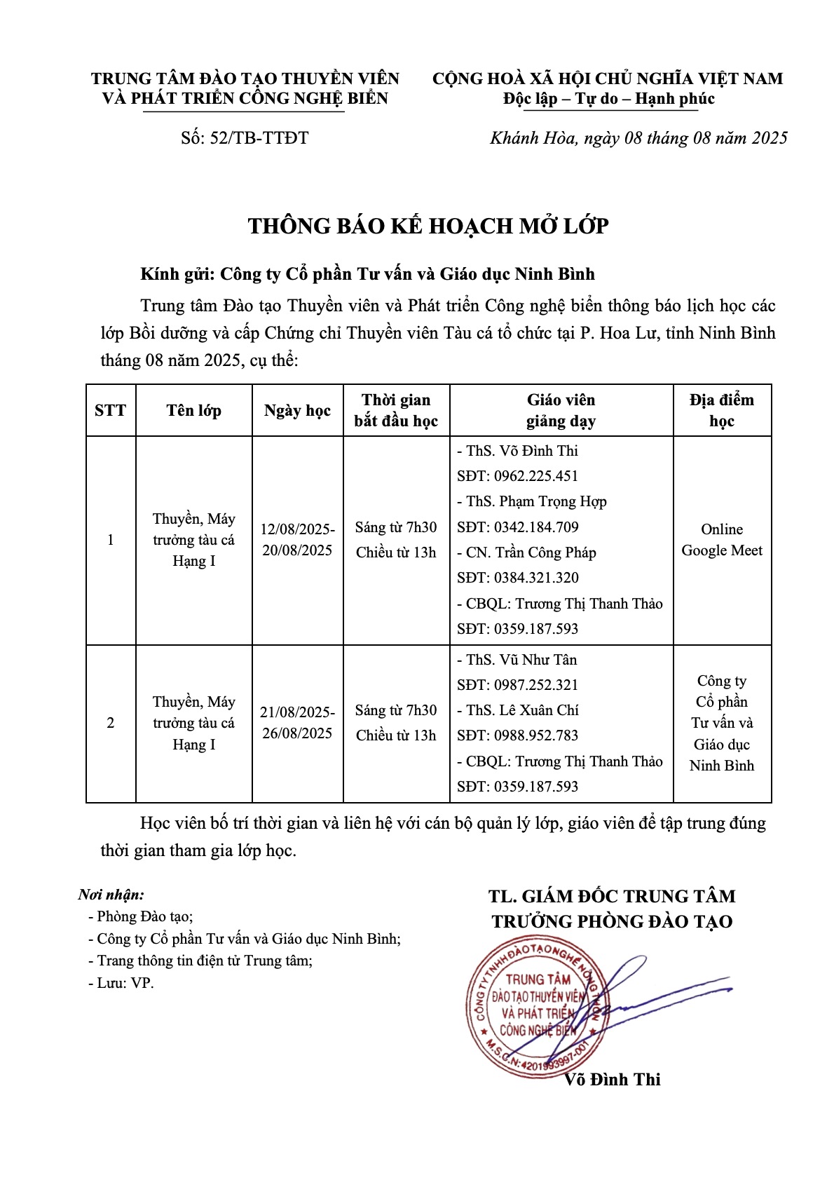 Thông báo - Kế hoạch Đào tạo tại P. Hoa Lư, tỉnh Ninh Bình tháng 08 năm 2025
