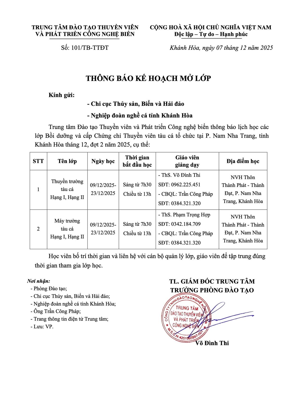 Thông báo - Kế hoạch Đào tạo tại P. Nam Nha Trang, tỉnh Khánh Hòa Đợt 2, tháng 12 năm 2025
