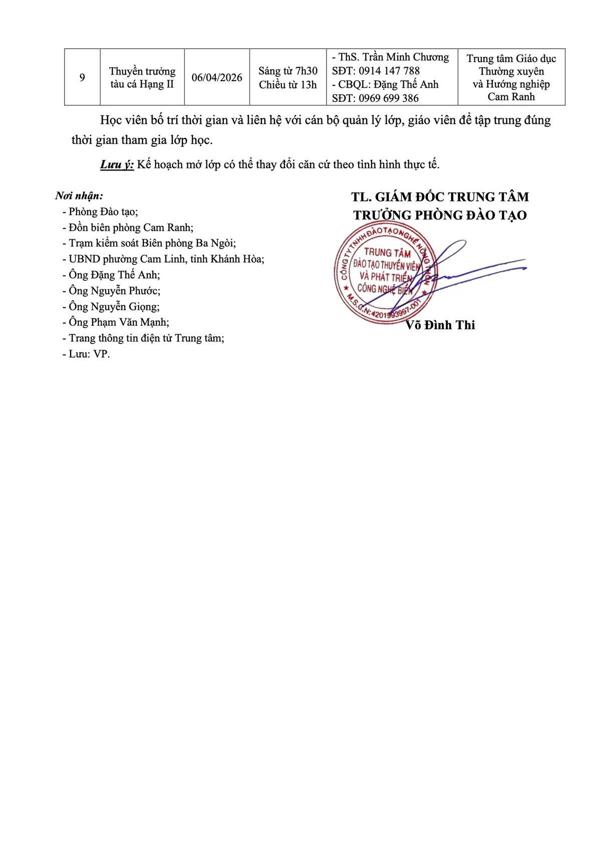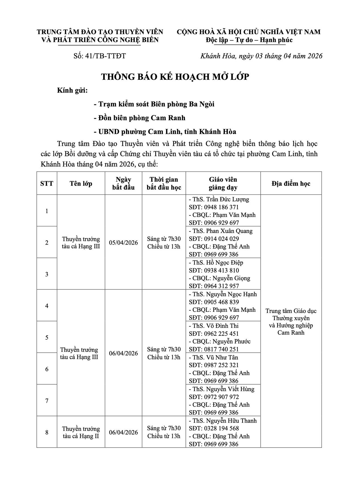 Thông báo - Kế hoạch Đào tạo tại phường Cam Linh, tỉnh Khánh Hòa tháng 04 năm 2026