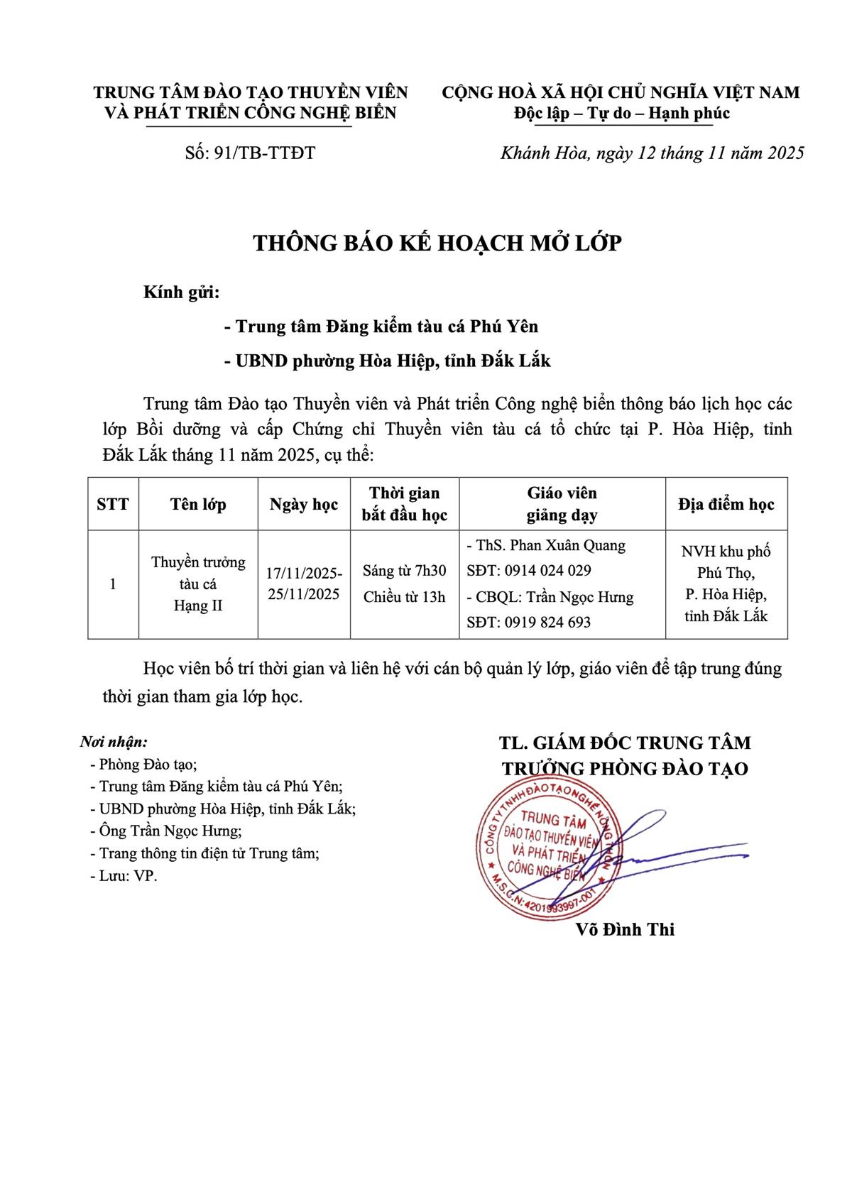 Thông báo - Kế hoạch Đào tạo tại phường Hòa Hiệp, tỉnh Đắk Lắk tháng 11 năm 2025