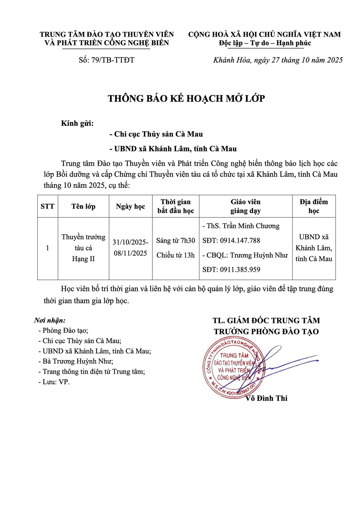 Thông báo - Kế hoạch Đào tạo tại xã Khánh Lâm, tỉnh Cà Mau tháng 10 năm 2025