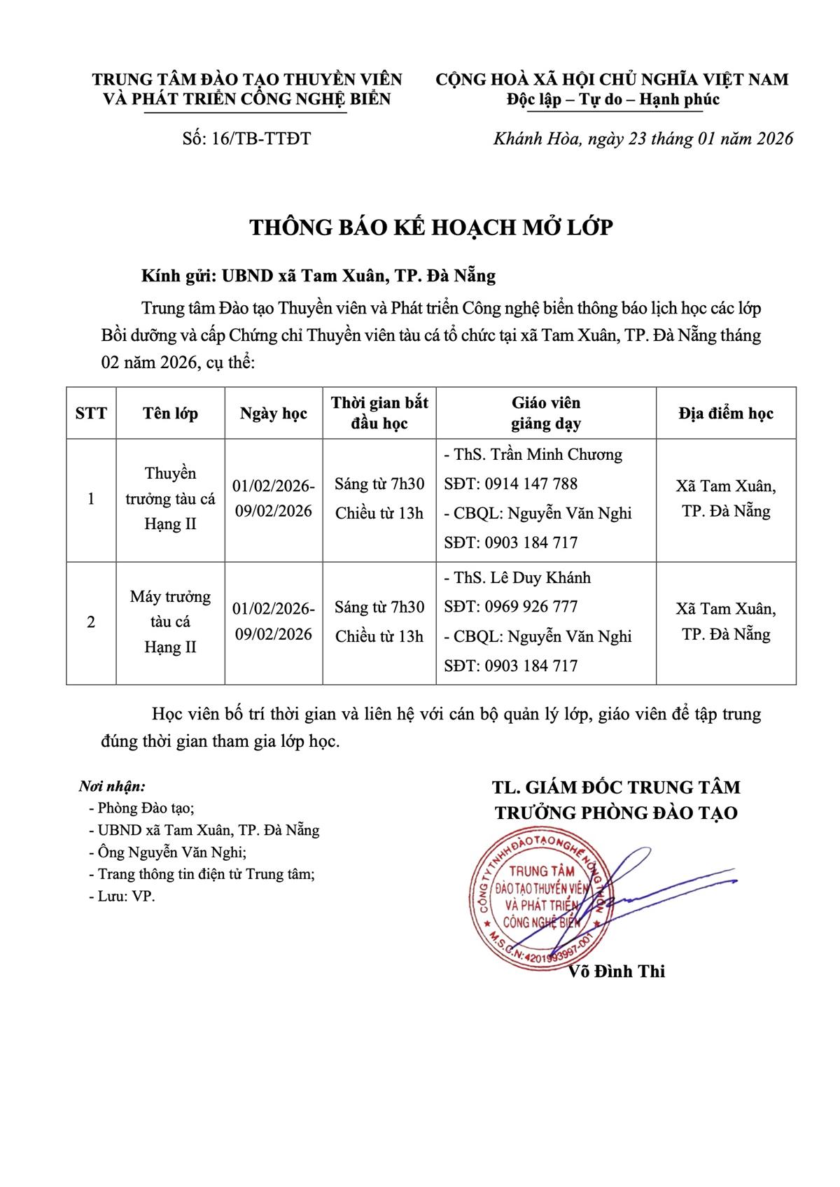 Thông báo - Kế hoạch Đào tạo tại xã Tam Xuân, TP. Đà Nẵng tháng 02 năm 2026