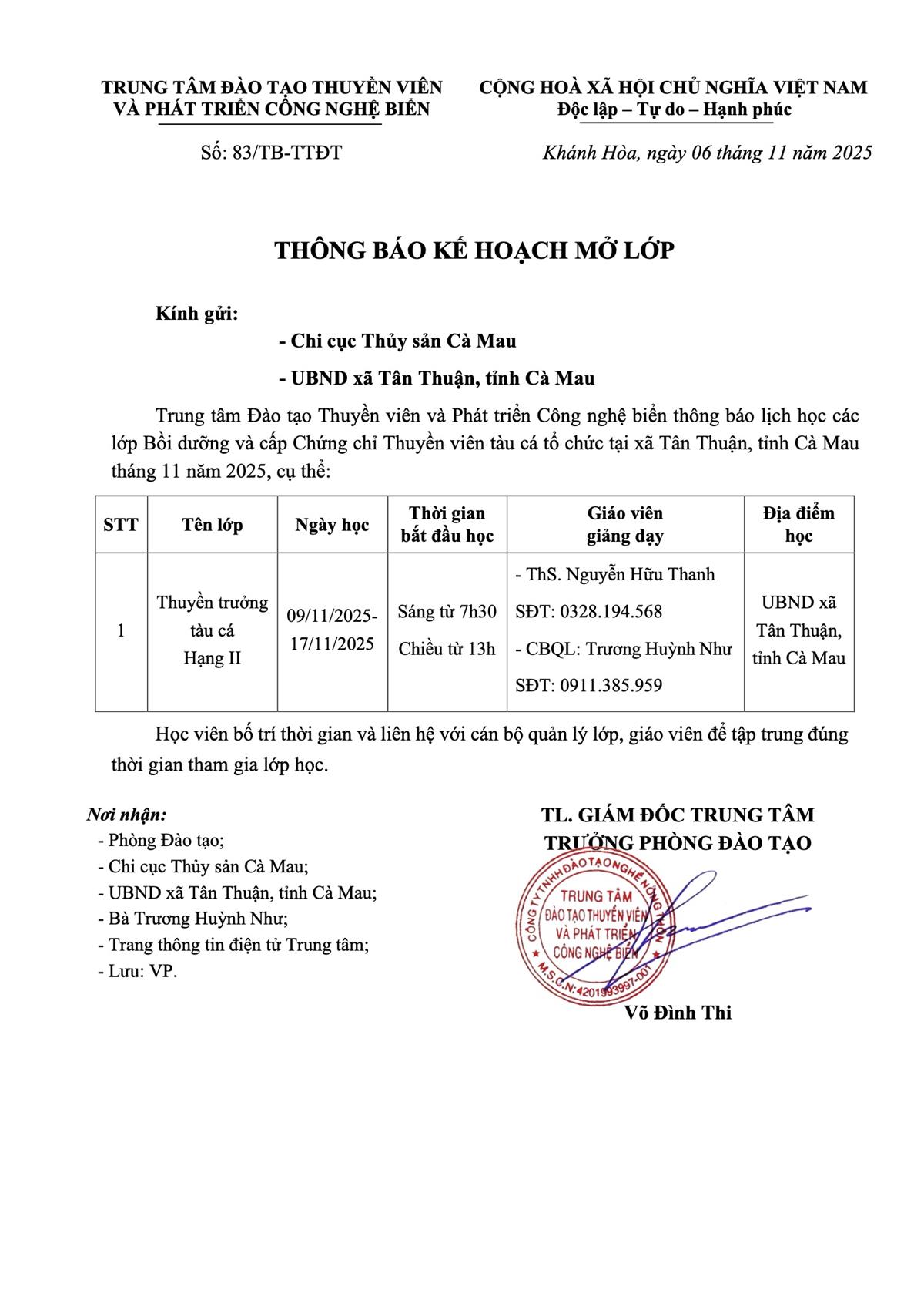 Thông báo - Kế hoạch Đào tạo tại xã Tân Thuận, tỉnh Cà Mau tháng 11 năm 2025