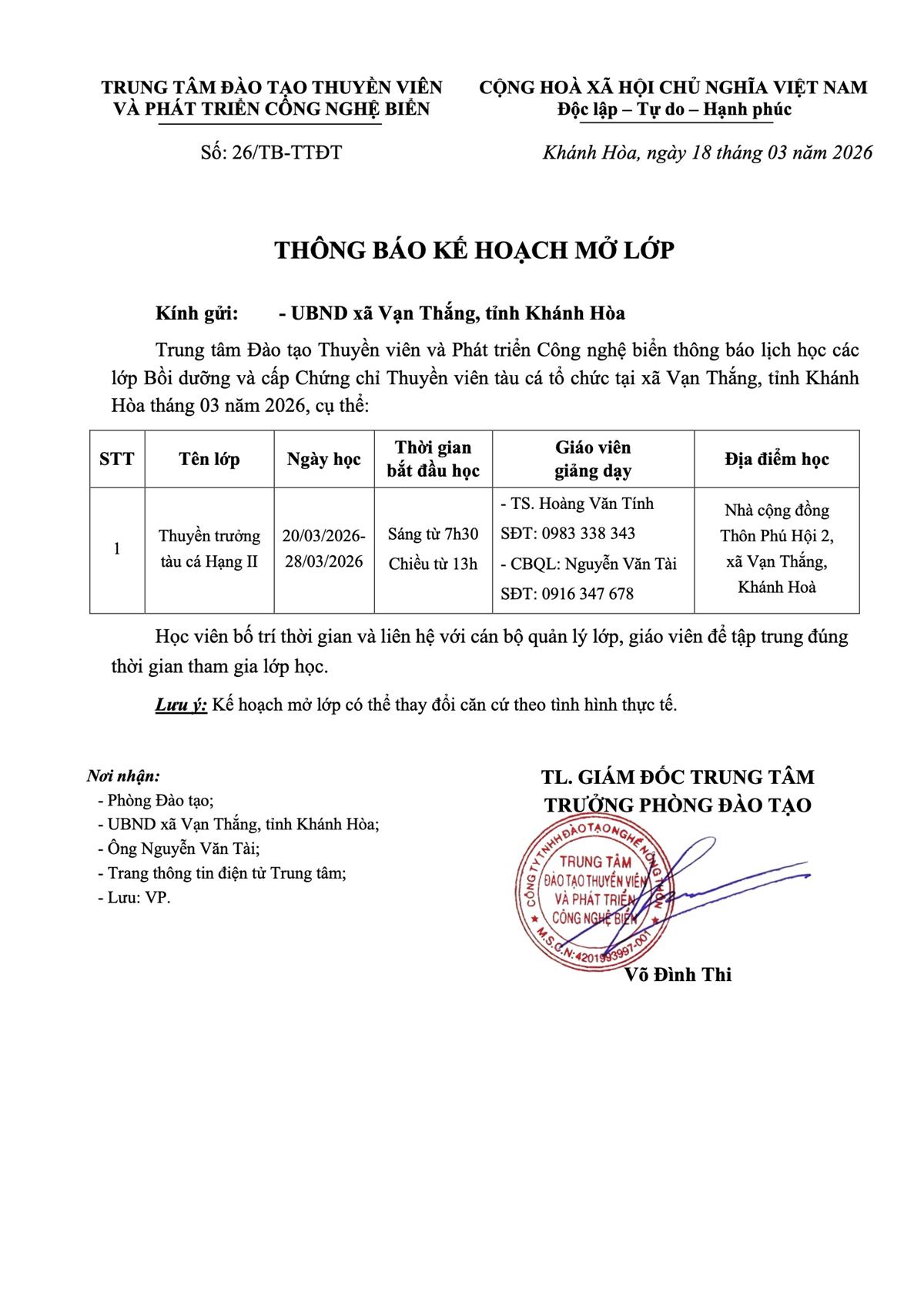 Thông báo - Kế hoạch Đào tạo tại xã Vạn Thắng, tỉnh Khánh Hòa tháng 03 năm 2026